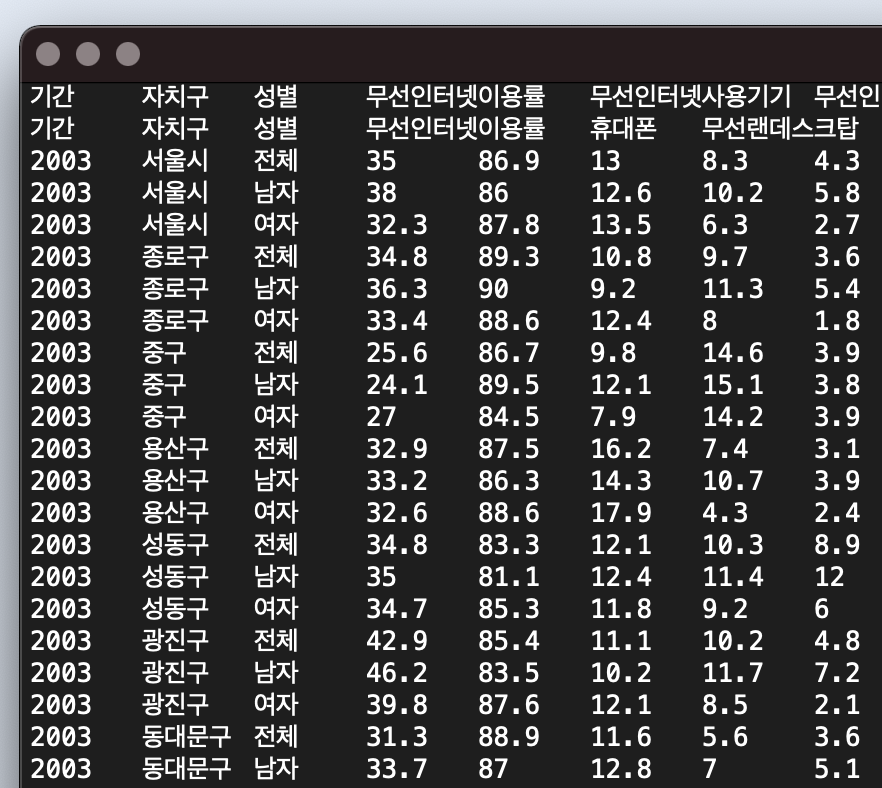 데이터에 콤마가 있으면 CSV로 제공이 안되는 데이터 포털데이터 포털에서는 콤마(,)가 들어가 있는 데이터는 CSV로 제공할 수 없다고 합니다. 한편 해당 데이터에는 콤마가 들어있지 않았습니다.